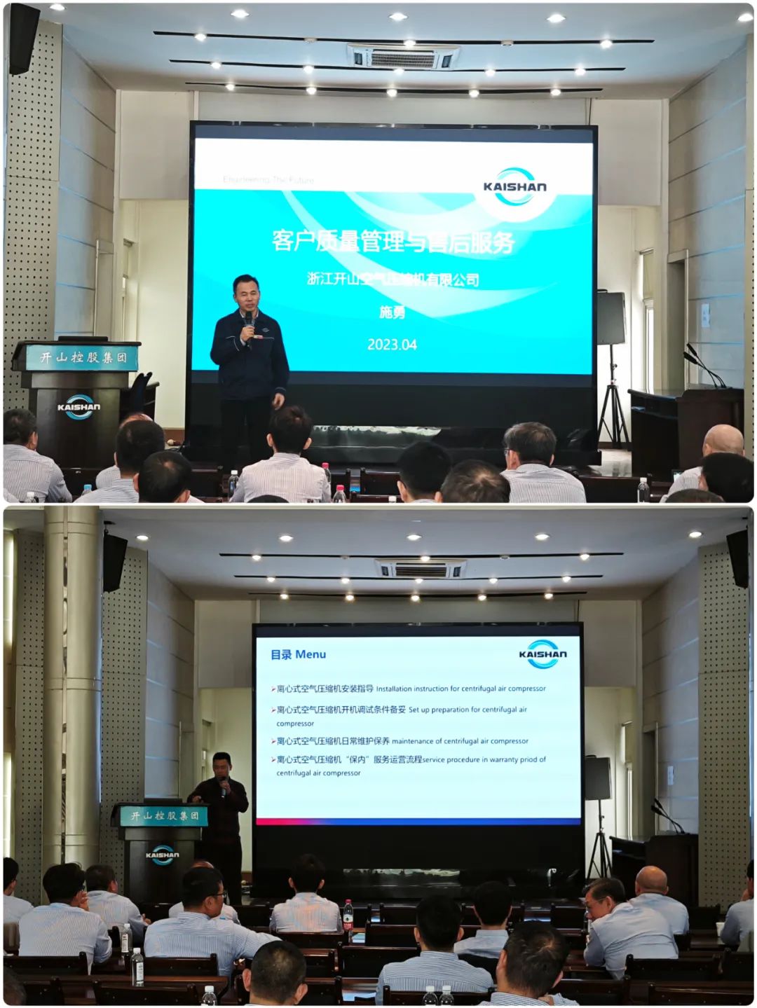 浙江開山壓縮機有限公司質量總監施勇做了開山傳統螺桿產品海外市場的支持流程和質量提升流程匯報,開山服務(上海)有限公司總經理楊轍做了離心機、PET等產品海外市場服務管理及服務培訓。